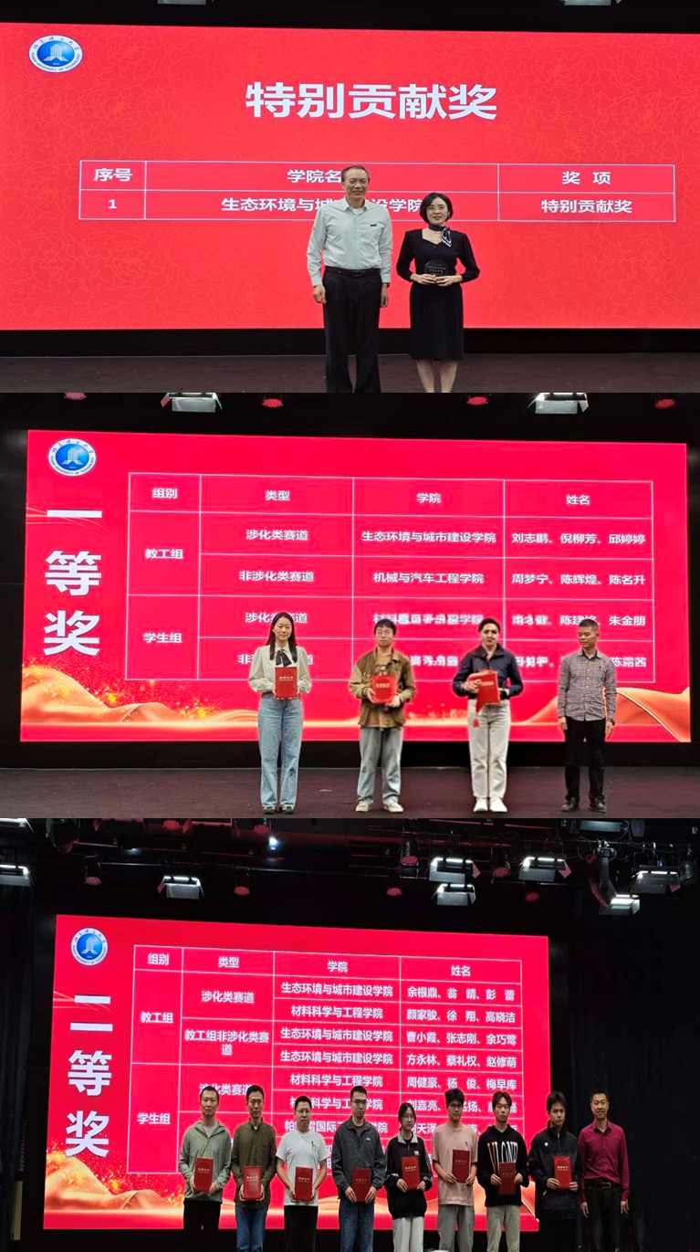 在大会颁奖环节,为表彰城环学院在赛事承办中的积极贡献,副校长刘国买亲自为我院颁发了大赛“特别贡献奖”。组委会随后宣布了大赛的获奖情况,我院教工组表现尤为抢眼,从全校200多支参赛队伍、500余名参赛师生团队中脱颖而出,分别斩获涉化类一、二等奖和非涉化类2项二等奖;学生组也不甘示弱,分别获得非涉化类三等奖2项、优胜奖1项。这些荣誉的取得,不仅是对我院师生实验室安全技能水平的肯定,更是对城环学院安全管理工作的高度认可。